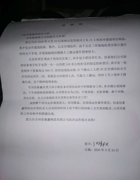 雖然整個項目運作難度很大,時間緊迫,且現(xiàn)場運作條件艱苦,但是佳豪鑫物流運作團隊在人員安排和時間上給予我們現(xiàn)場施工方完美的配合,讓項目接收工作有秩序和圓滿完成。