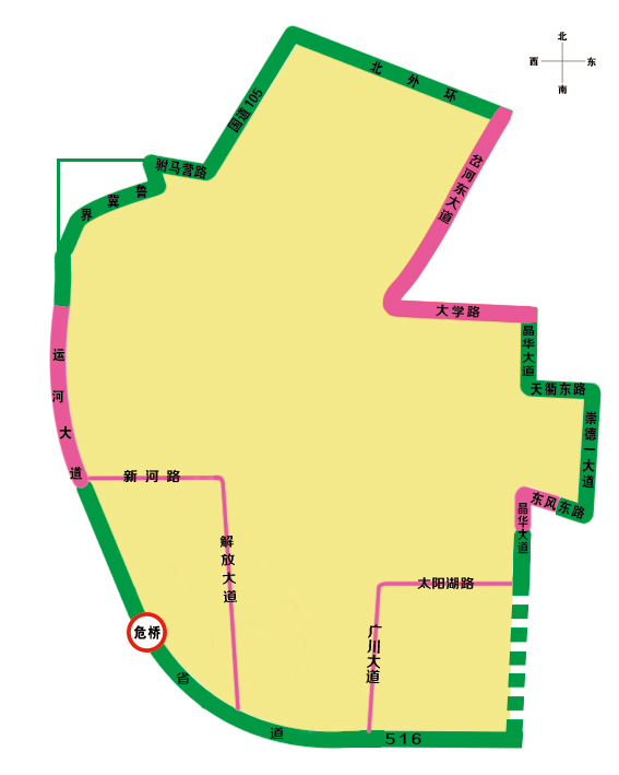 ? 駙馬營路—G105—北外環(huán)—岔河?xùn)|大道—大學(xué)東路—晶華大道(北段)—天衢東路—崇德一大道—東風(fēng)東路—晶華大道(南段)—S516—運(yùn)河大道—魯冀界以內(nèi)。